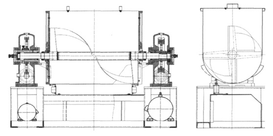 佰利乐 容器回转型的特点是混合机的储料槽连续旋转,从而导致槽内物料混合均匀,此类混合机结构简单,混合速度慢,混合度较高,混合机内部清扫容易。适用于那些物性差异小、流动性好的粉体间的混合,也适用于有磨损性的粉粒体的混合。其结构如图所示: