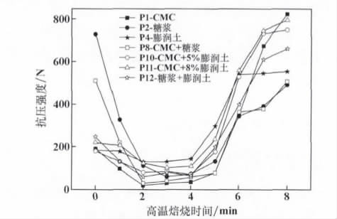 根据上述研究结果,选取强度符合要求的球团P1、P2、P4、P8、P10、P11 及 P12 测定其高温强度,其结果如图 1 所示。不同配比粘结剂在高温焙烧过程中强度变化趋势基本一致,在焙烧初期球团抗压强度降低, 后期球团强度又逐渐提高。