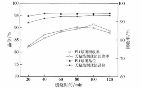 确定球团 P11 为优选配方后,对其进行直接还原焙烧-磁选试验。无粘结剂球团作为对照试验,考察粘结剂对球团直接还原焙烧磁选的影响。从图3 可以看出,两种球团随焙烧时间的变化趋势基本一致,随着焙烧时间的延长,直接还原铁产品品位变化不大;回收率呈先升高后缓慢降低的趋势。